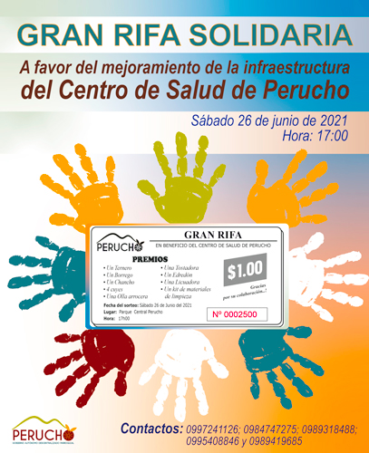 Es preciso informar que los GAD´s Parroquiales no tienen la competencia exclusiva para invertir en Salud, sin embargo el Gobierno Parroquial de Perucho, preocupado por el mal estado de la infraestructura del Centro de Salud de la parroquia, ha toma la iniciativa de realizar una RIFA SOLIDARIA, considerando el gran espíritu de colaboración de toda la comunidad peruchana; y de esta forma conseguir una parte de los recursos necesarios para dar mantenimiento al Centro de Salud que presta atención médica a los pobladores de Perucho y de las parroquias que conforman la Ruta Escondida.